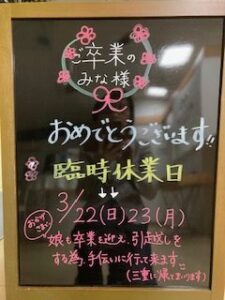 伊勢市御薗町にありますみそのめがねです 2月も無事営業終了です!! ご来店賜りました皆さま 誠にありがとう御座いました(*ノωノ) 3月ですが 臨時休業日がございます(*ノωノ) 来る 3月22(日)・23(月) の2日間 お休みをいただきます(*ノωノ) 娘の引越しの手伝いに 山梨へ~ 自力の引っ越し 大変やろなぁと 想像・・・ 娘と荷物 伊勢に連れて帰ってきます 何とぞよろしくお願いいたします(*ノωノ) 卒業シーズン🌸到来ですね!